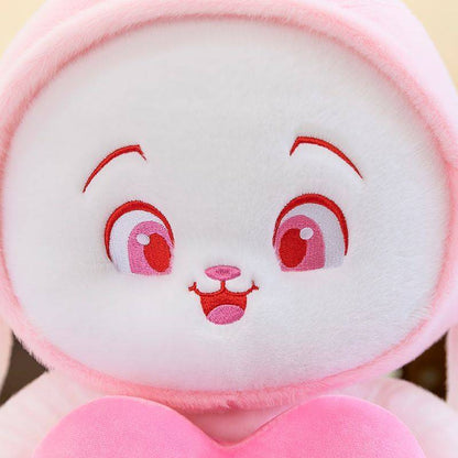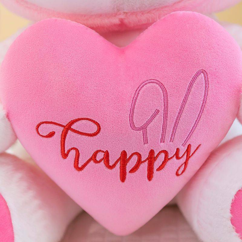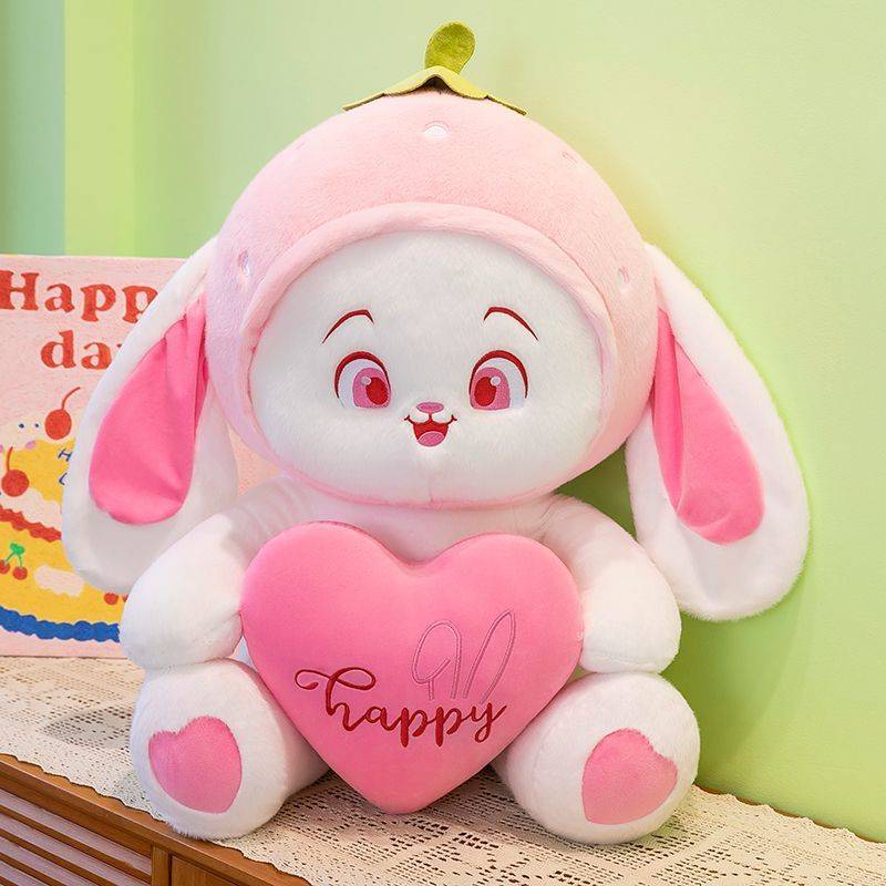 Meet the sweetest, happiest bunnies around! 🐰💖 These adorable bunny plushies are dressed like strawberries and holding cute heart-shaped pillows that say "Happy." With their big, bright eyes and super-soft fur, they’re ready to bring smiles and love to anyone who needs it!