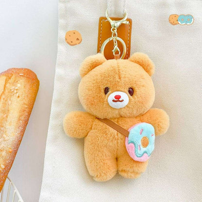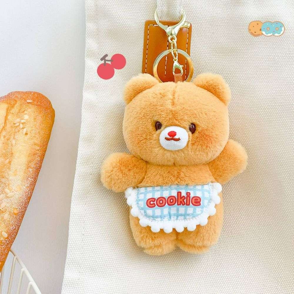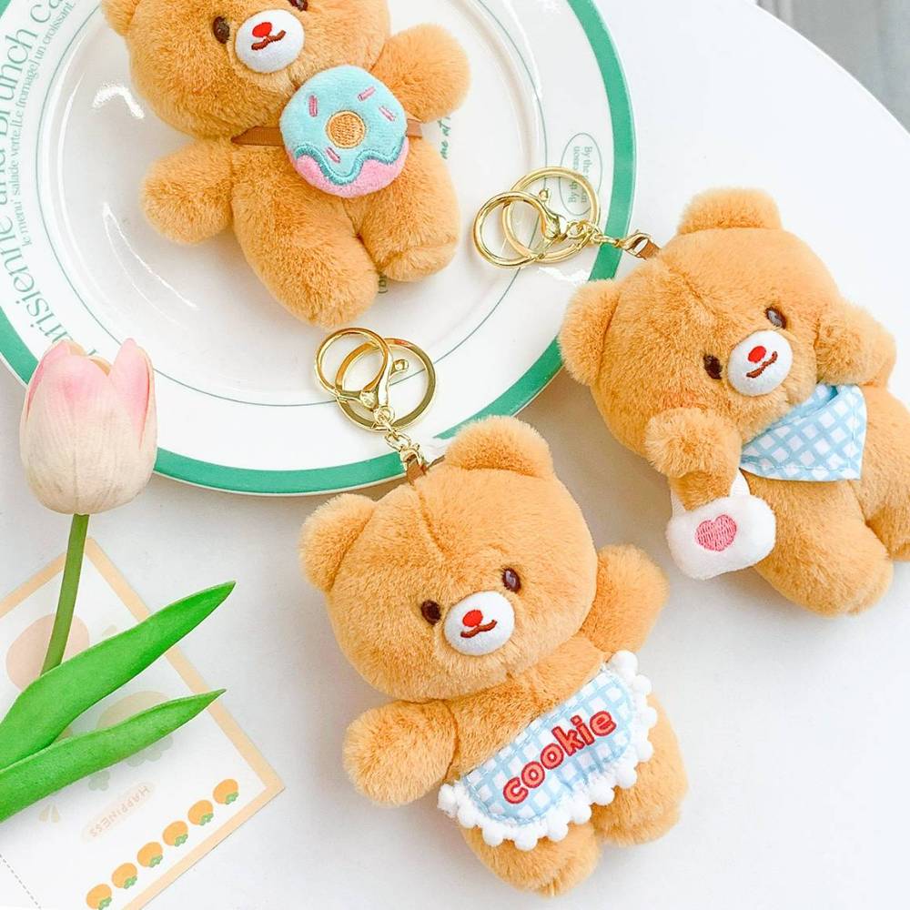 Meet these super cute teddy bear plush keychains! 🐻✨ Each bear comes with its own adorable accessory—one’s got a donut, another's holding a bag, and one even sports a "cookie" apron! These little plushies are perfect for adding some charm to your keys, bag, or backpack.