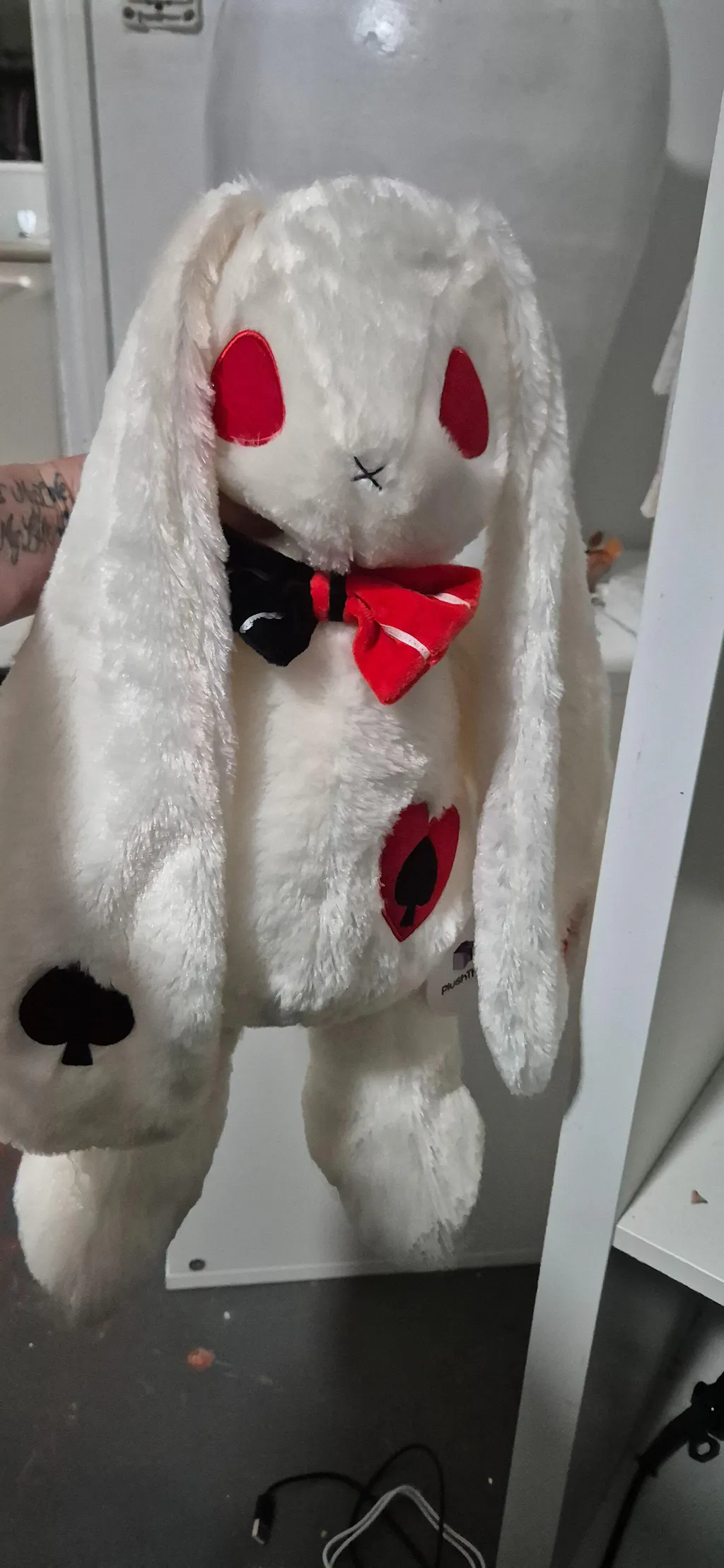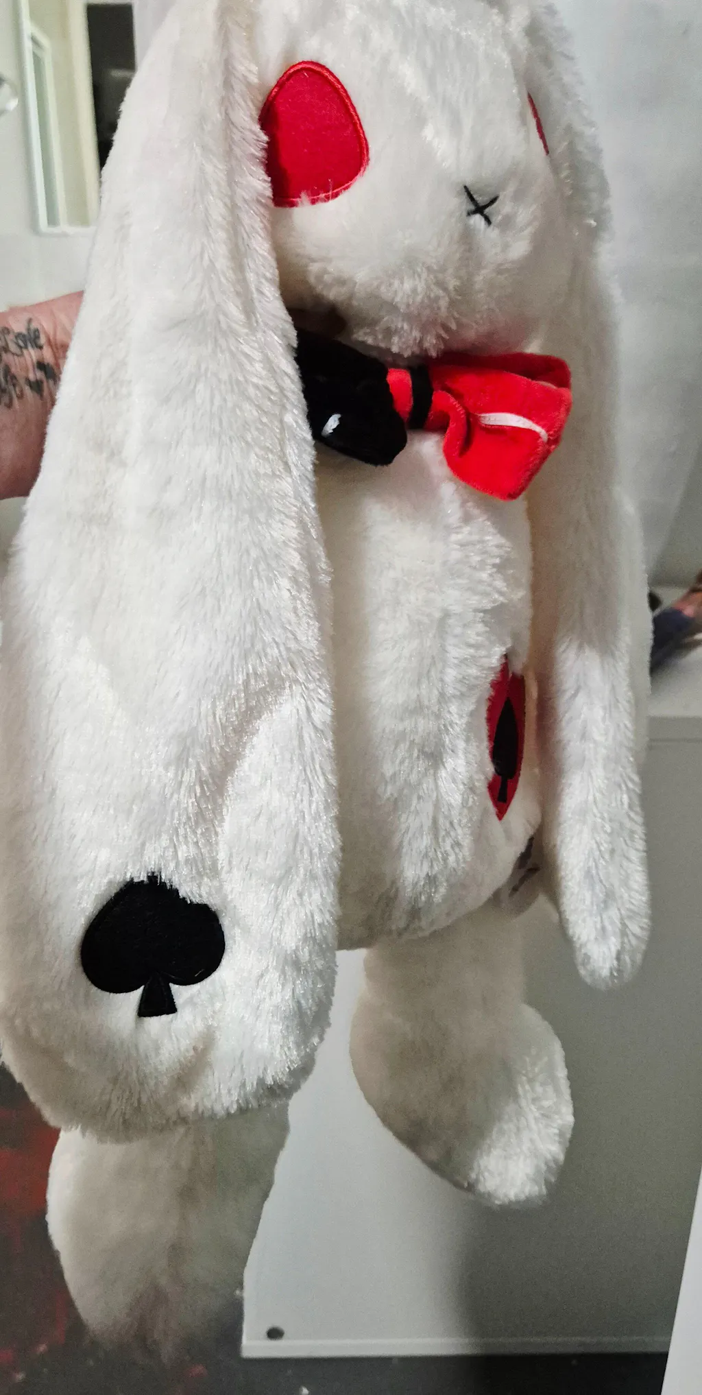 This Emo white rabbit is made of super-soft white faux rabbit fur. It’s got bright red patches for eyes, ears, and patterns that look super spooky! Black patterns balance it out, giving it that cool emo vibe. The red-and-black bow tie is a perfect touch. And its tiny mouth is embroidered with thin black thread, making it both cute and quirky!